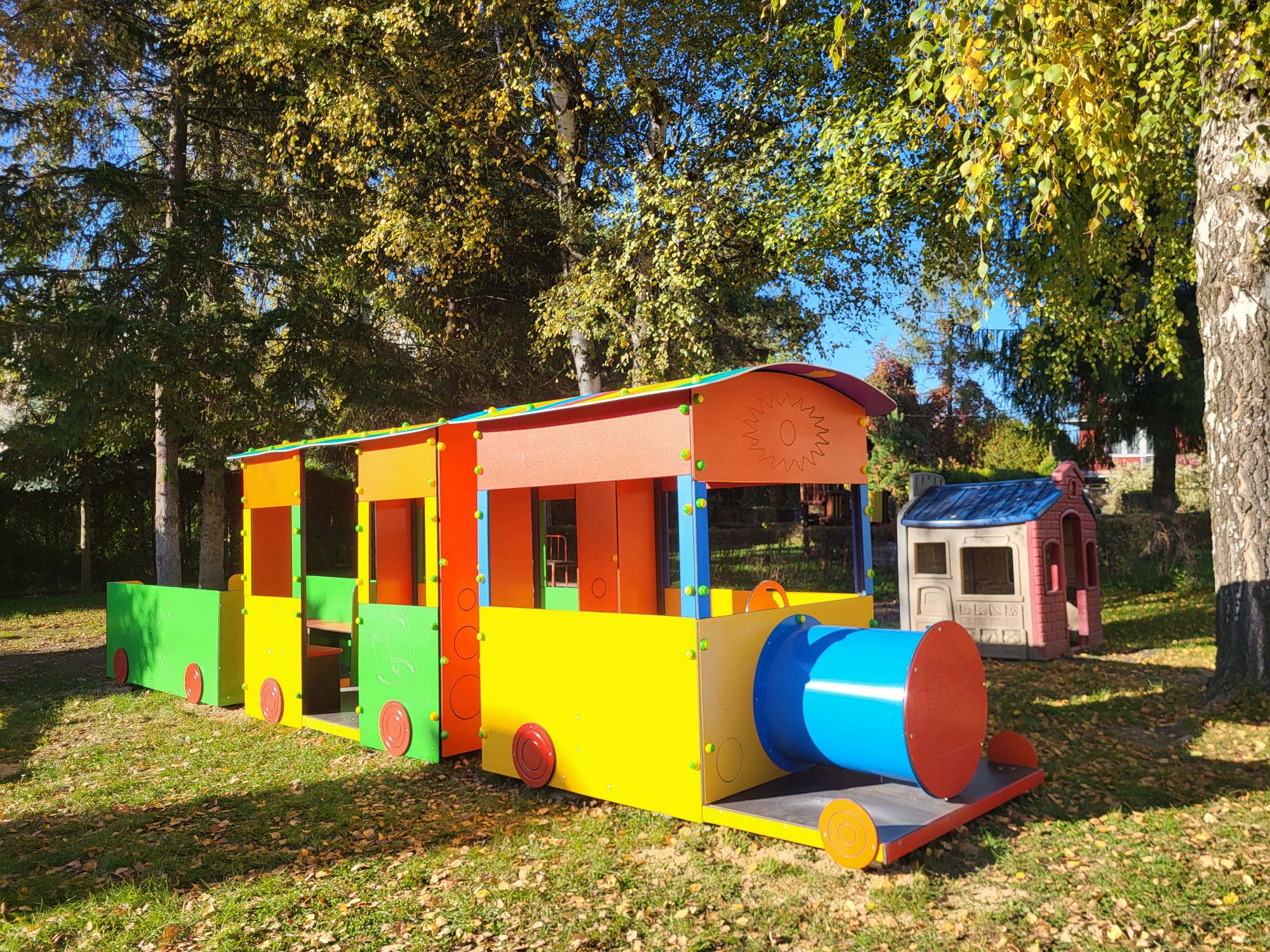 22.10.2025 Cudowne słońce, jesień i nasza realizacja w Przedszkolu w Andrychowie. Kolorowy pociąg, który zagościł na stałe w ogródku przedszkolnym.