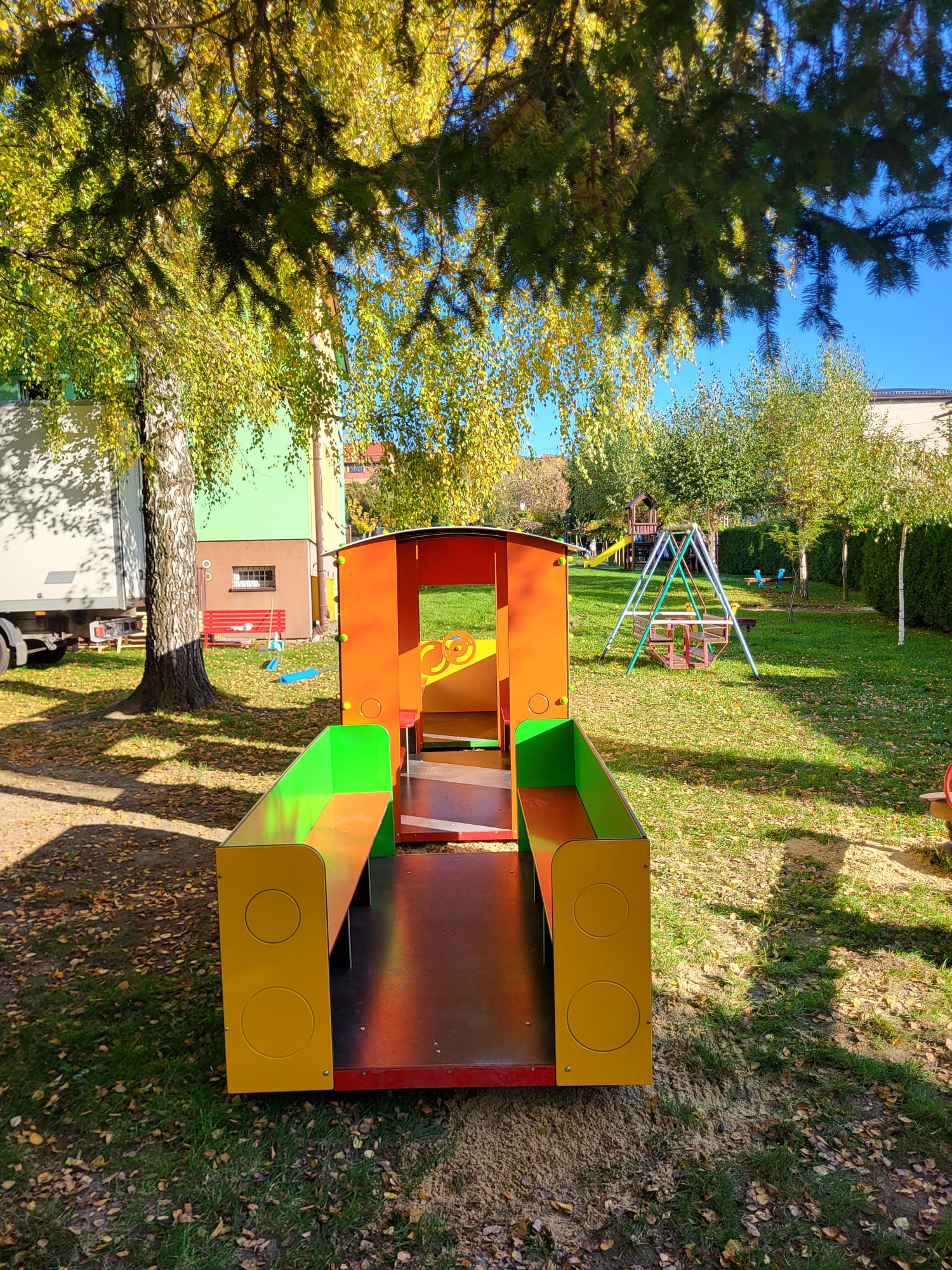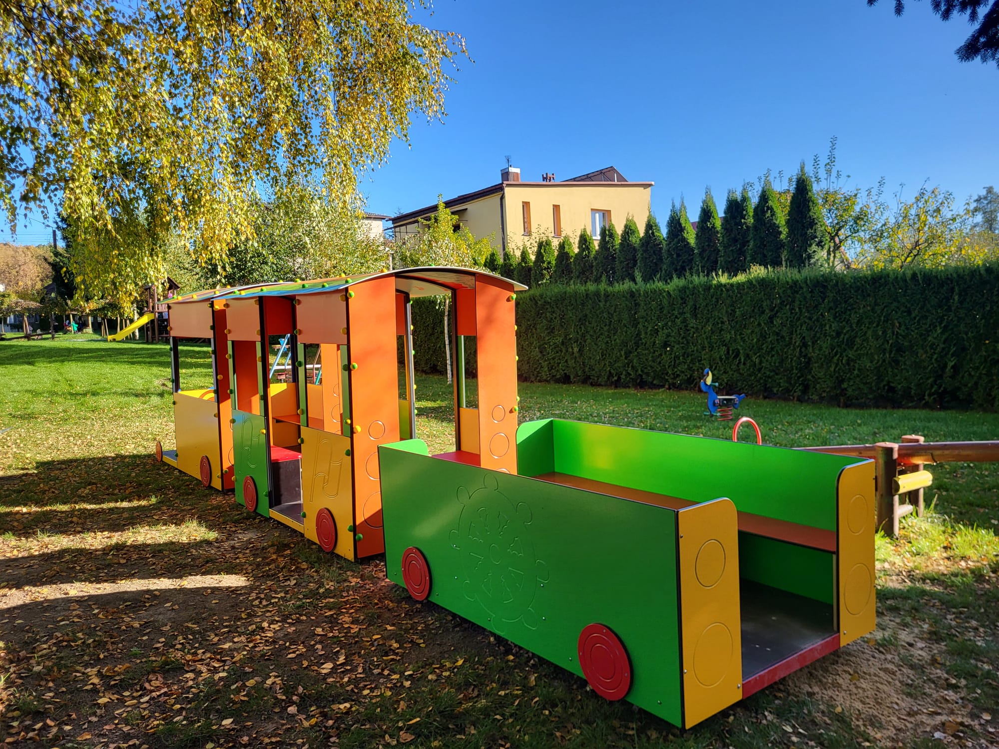 Kolorowy pociąg, który zagościł na stałe w ogródku przedszkolnym, będzie przypominał dzieciom o podróżach tych bliższych i dalszych.