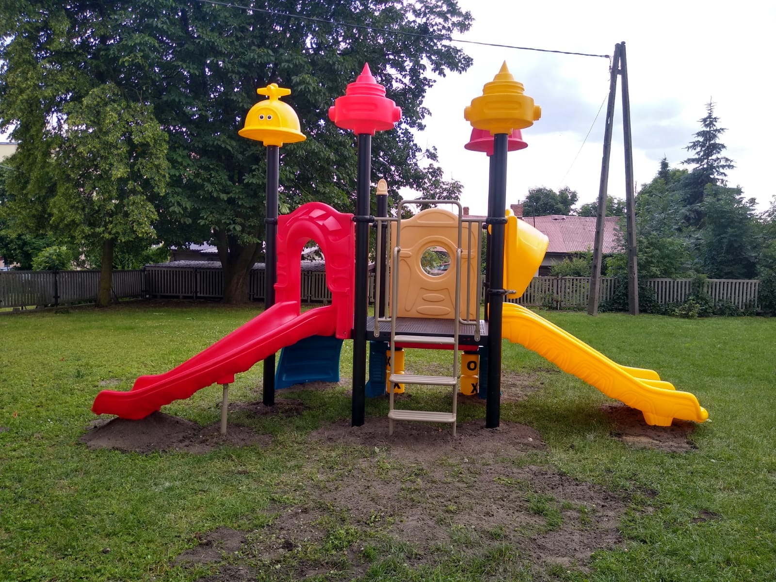 Mały, kolorowy, funkcjonalny plac zabaw HELIKO z dwiema zjeżdżalniami i kocim grzbietem w Pińczowie.