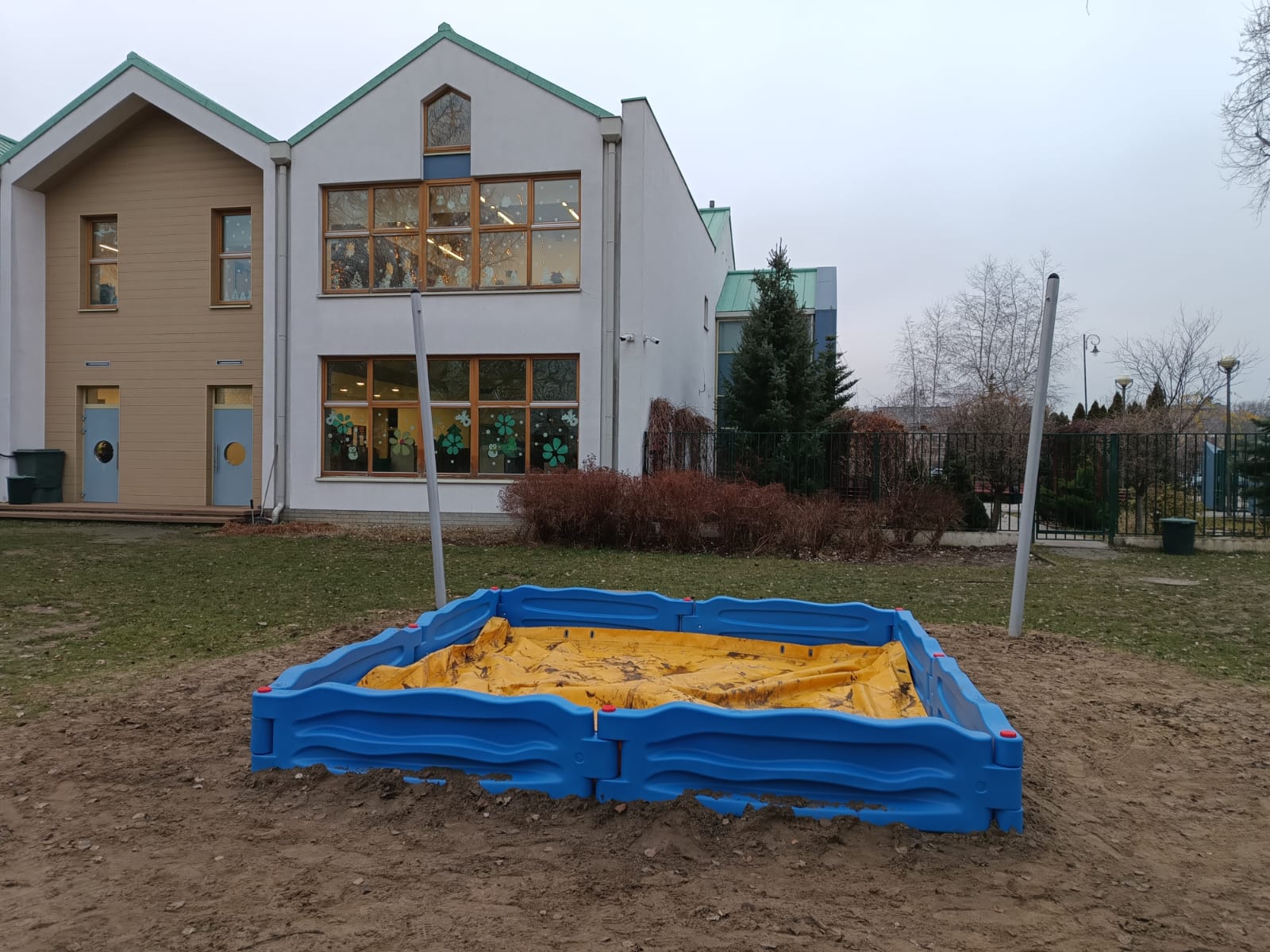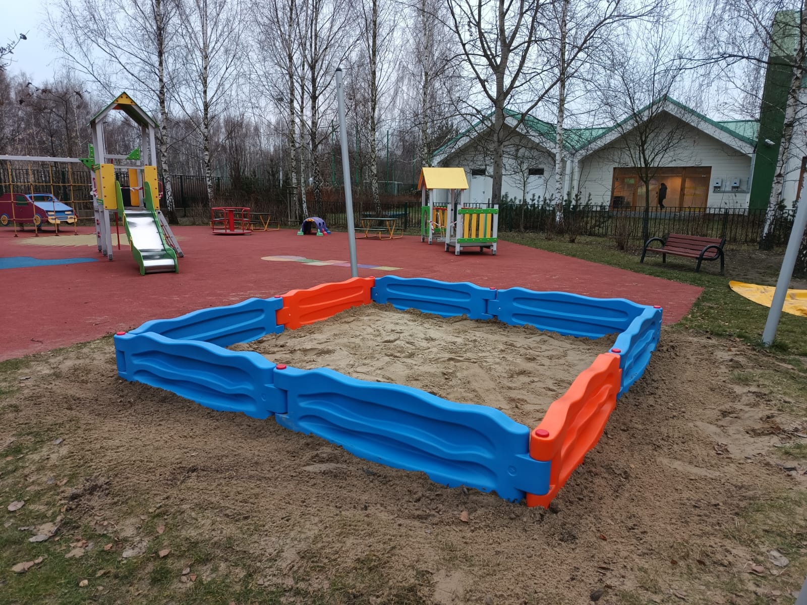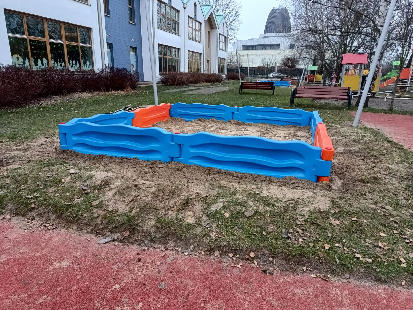 Modułowa piaskownica dla dzieci złożona z elementów realizacja w Warszawie.