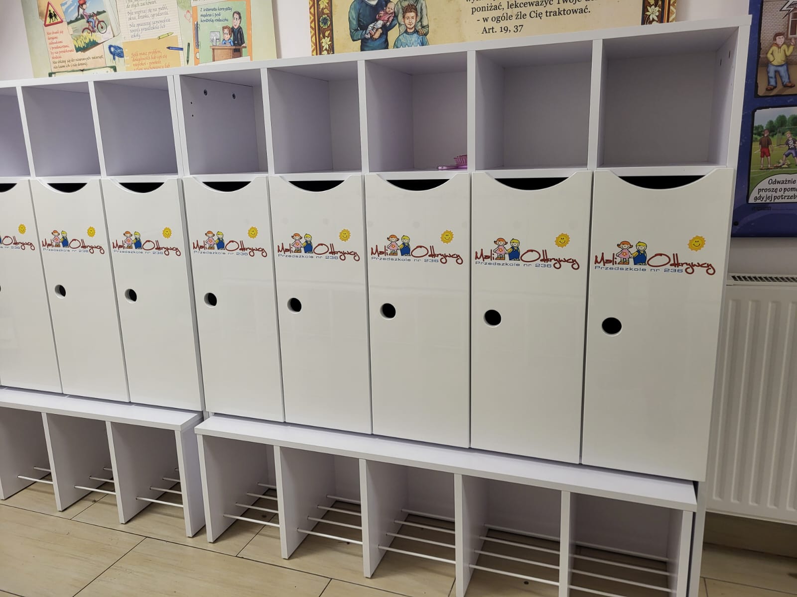 Cudowna realizacja szatni S4, biel, połysk, estetyka i logo przedszkola. Zaprojektuj z nami szatnie marzeń.